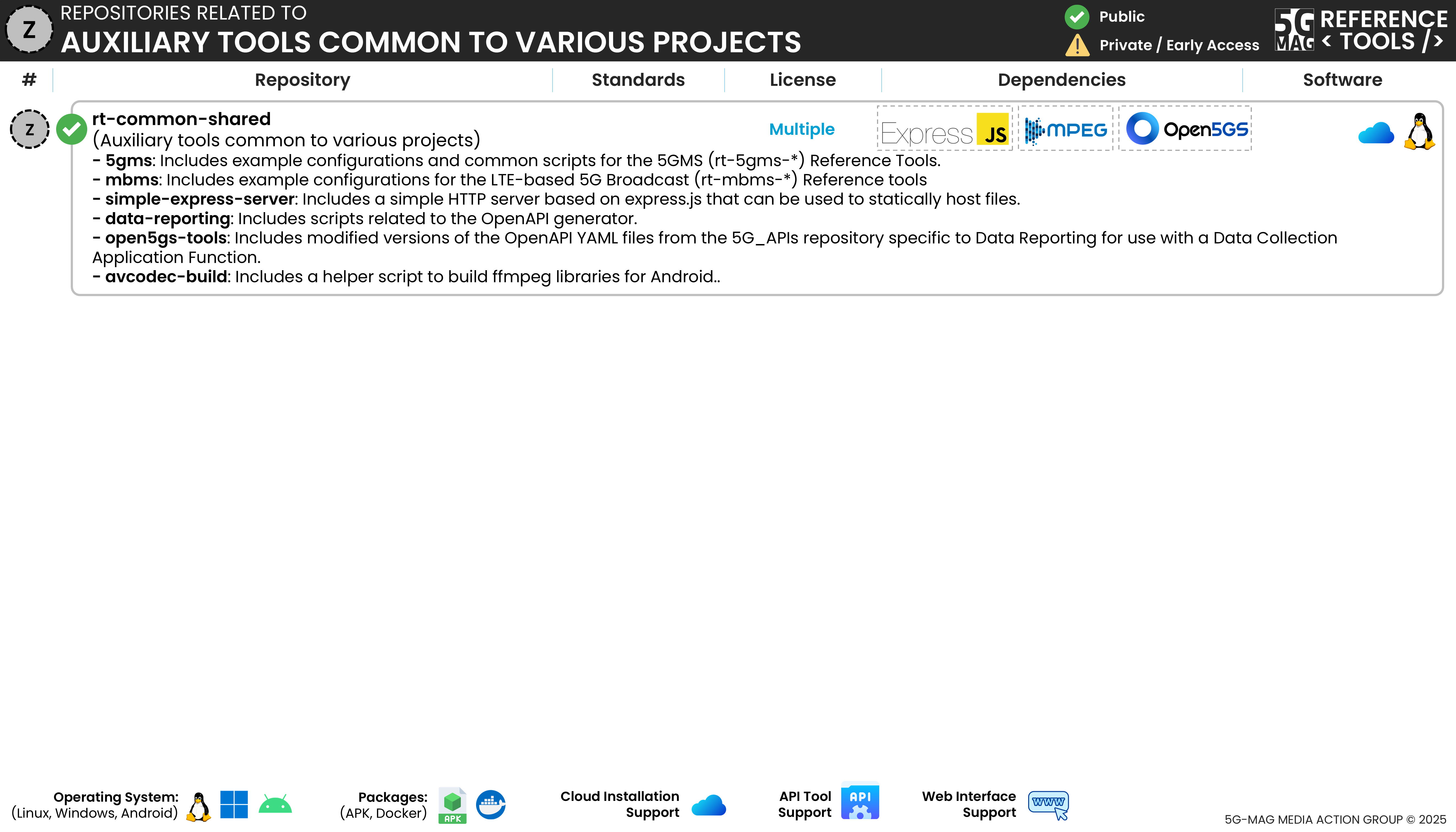 The following repository contains a series of auxiliary tools that may be used by different 5G-MAG Reference Tools projects. Please refer to the “Scope & Architecture” sections of the different projects for more context.